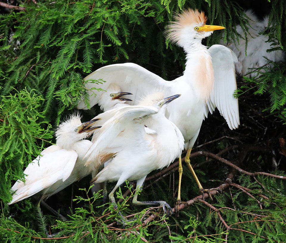 Unlike other herons and egrets, the Cattle Egret spends more time in dry fields than streams and ponds. It often follows cattle, horses, tractors or lawnmowers, bobbing its head, waiting for insects to be flushed out. Originally from Africa, it made its way to North America around 1950 and is now abundant.