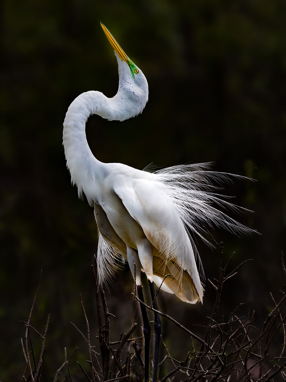 It is sometimes confused with its smaller cousin, the Snowy Egret, who’s coloring is reversed – yellow feet and a black bill.