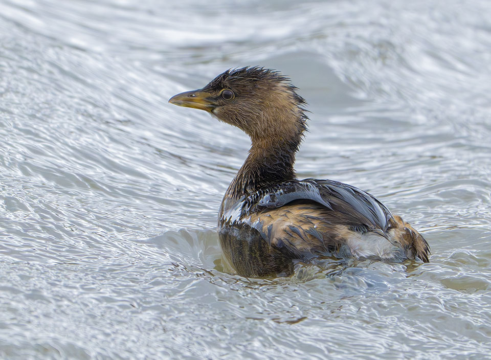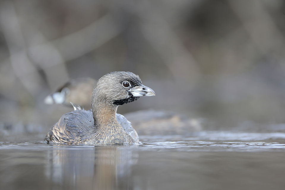 A small, chunky waterbird, the Pied-billed Grebe can be found in ponds on Galveston’s west-end. It forages by diving or slowing sinking underwater. The young can swim soon after hatching.