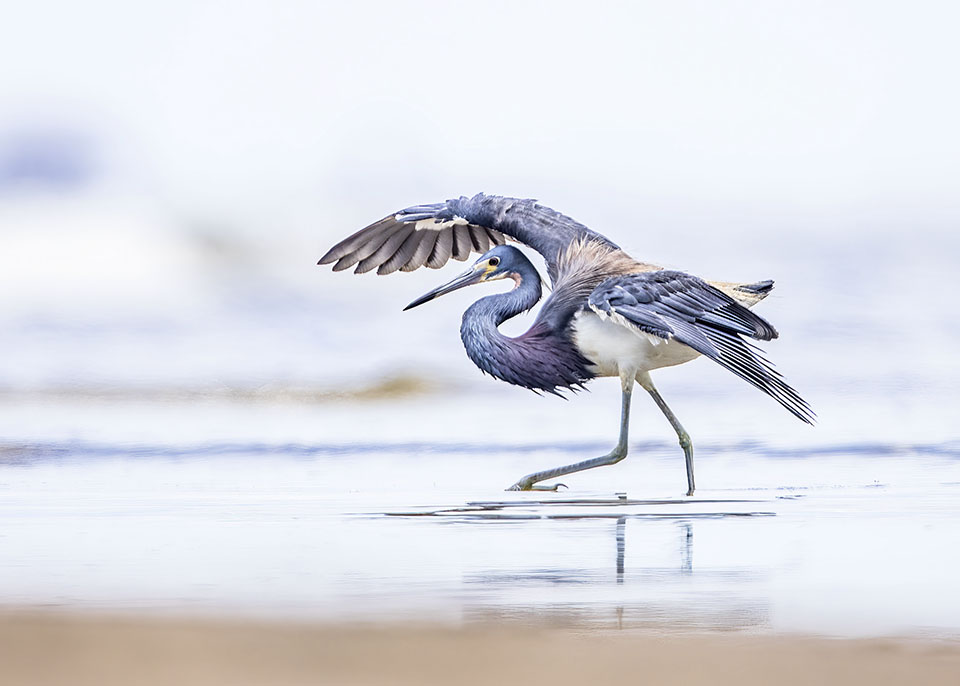 A small slender heron, the Tricolored Heron has a long bill and neck with long blue plumes on the head and neck . It forages alone by standing still in water, sometimes belly-deep, waiting for small fish, crustaceans and insects to approach. Sometimes you will see them running in pursuit of a school of fish.