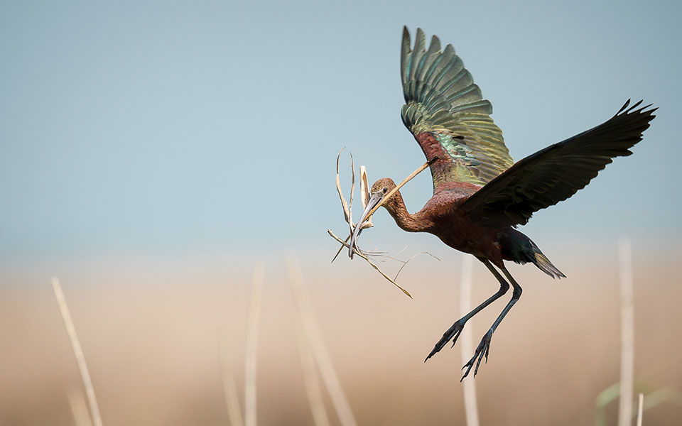 A large maroon wading bird, White-faced Ibis have a white border around the eye with a bare patch of skin in front. The white border helps differentiate it from the Glossy Ibis. It forages using it’s long curved bill in shallow water and soil for insects, crustaceans and earthworms.